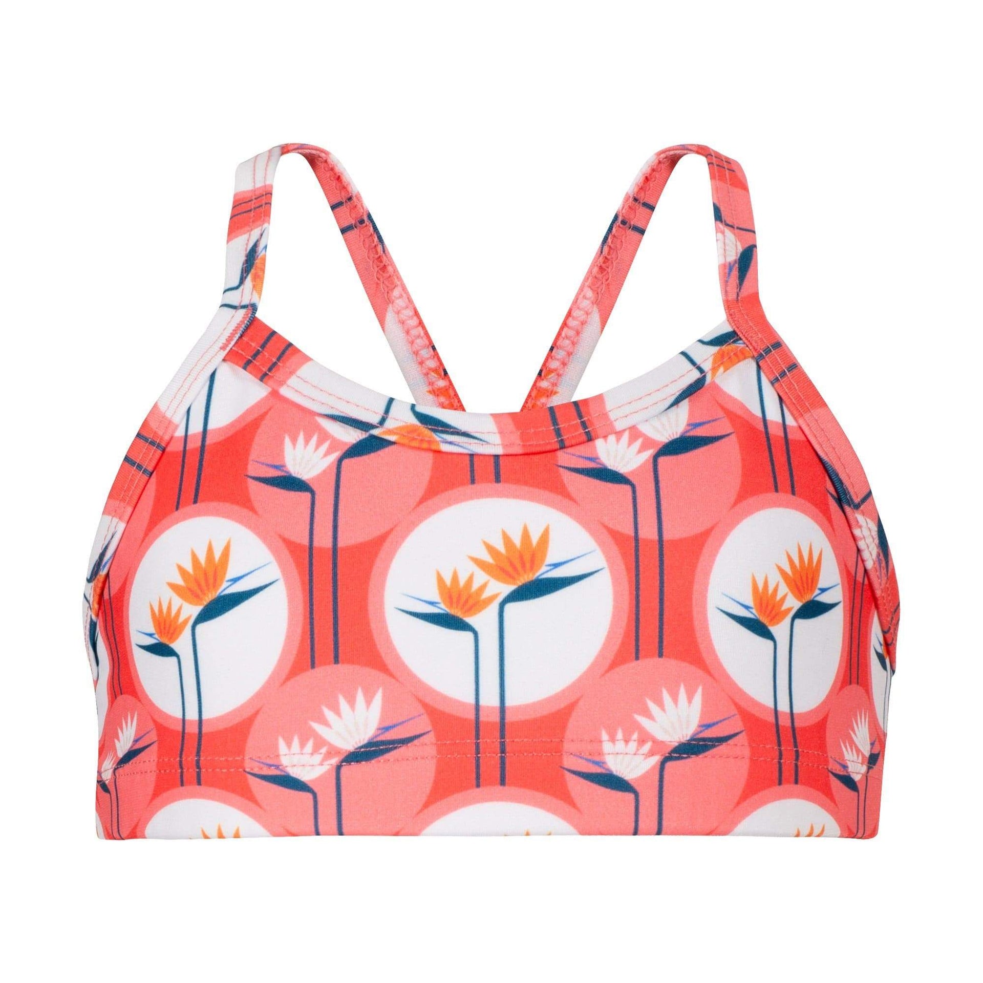 Pair our Birds of Paradise bikini top with the matching bikini bottoms for a stylishly cool look this summer. Athletic style racerback straps make this bikini top great both for swimming lessons in the pool and underneath your rashie at the beach. Team them with any of this seasons bikini bottoms or girls swim shorts and children's rashies from our girls swimwear range for a stylish sun safe look this summer.