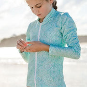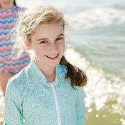 This Mint Flower Pebble design is stylish enough to suit both toddlers and teenagers. Our full front zip rashies are popular with girls of all ages and make getting your rashie on and off a breeze! Team it with any of the girls swim shorts or girls bikinis in this year's kids swimwear collection for a stylish sun safe look this summer.